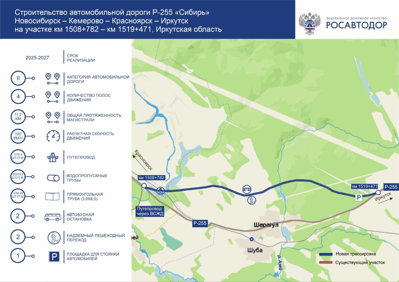 Завершить строительство обхода планируется в 2027 году. Его проведут по национальному проекту «Инфраструктура для жизни». Обход позволит вывести транзитный транспорт из села Шерагул и существенно снизить нагрузку наего центральную улицу, по которой сейчас проходит трасса Р-255 «Сибирь».