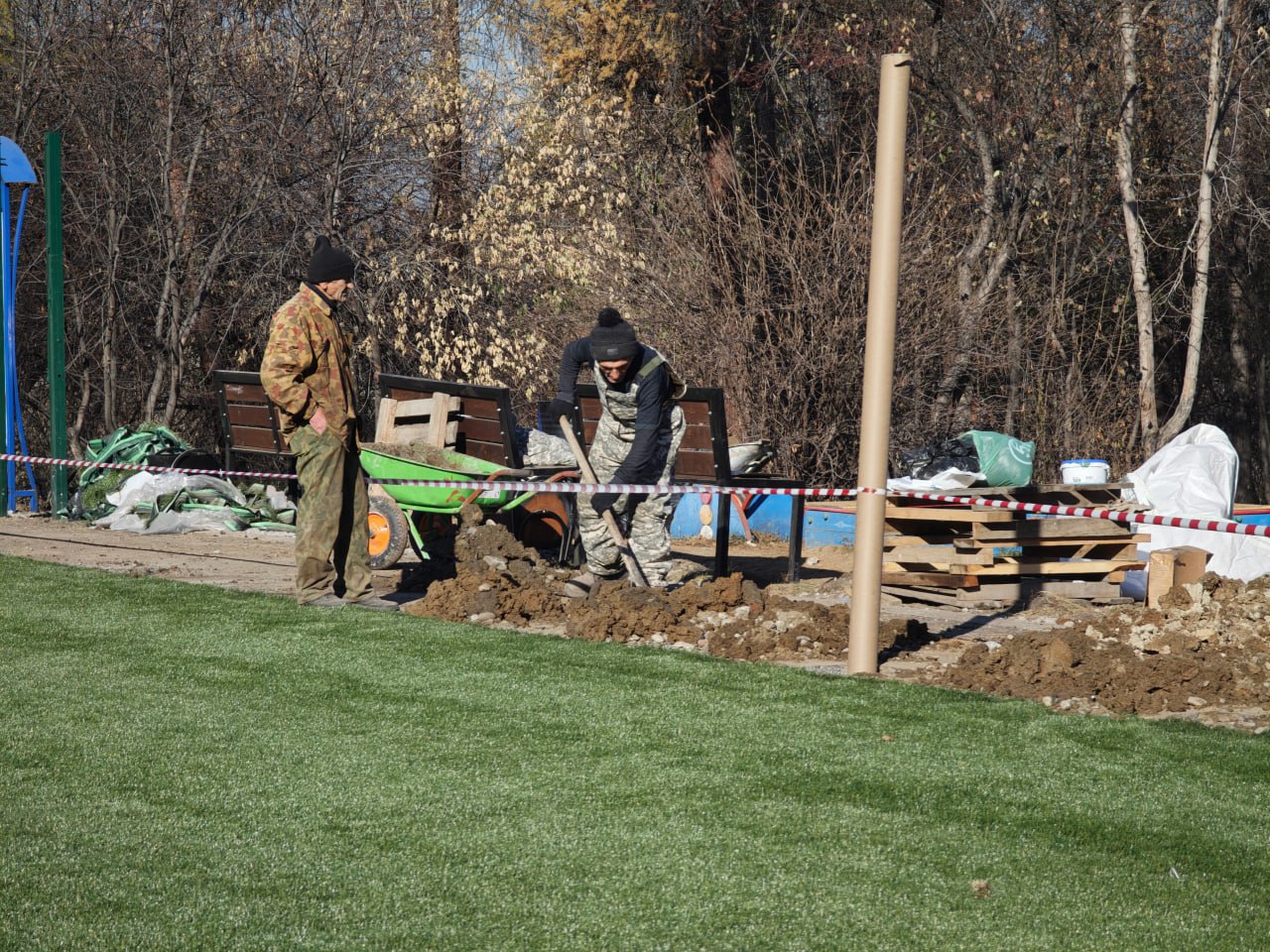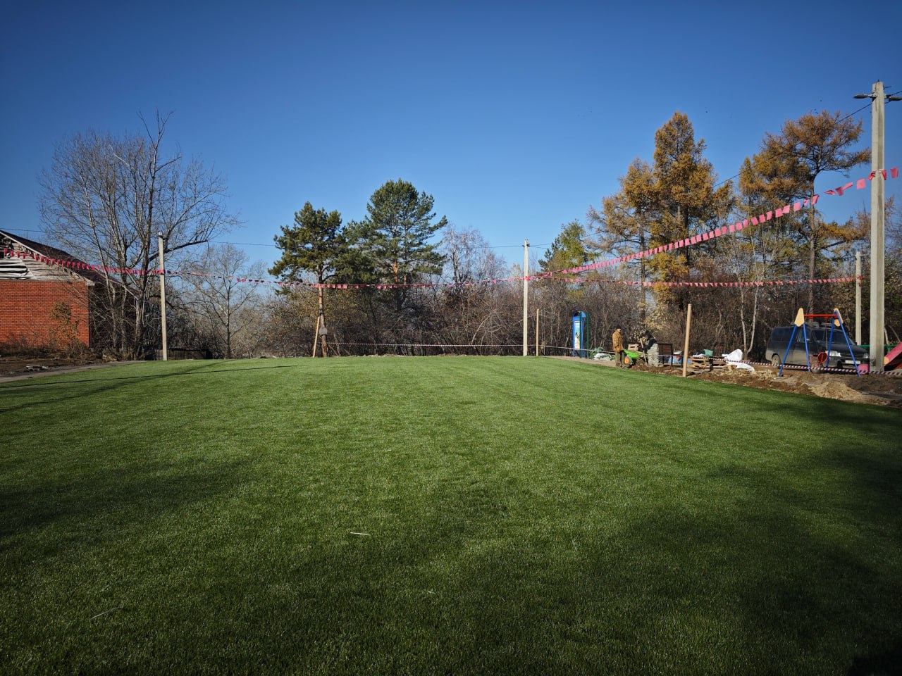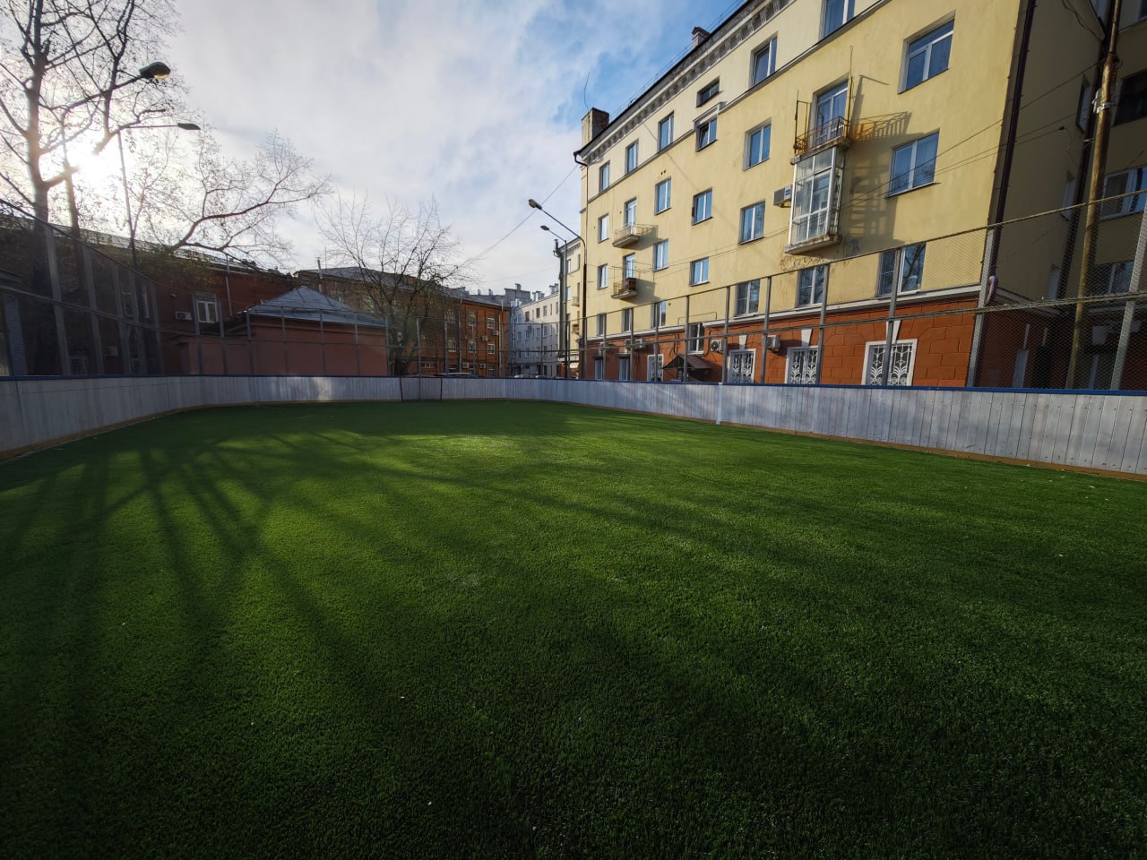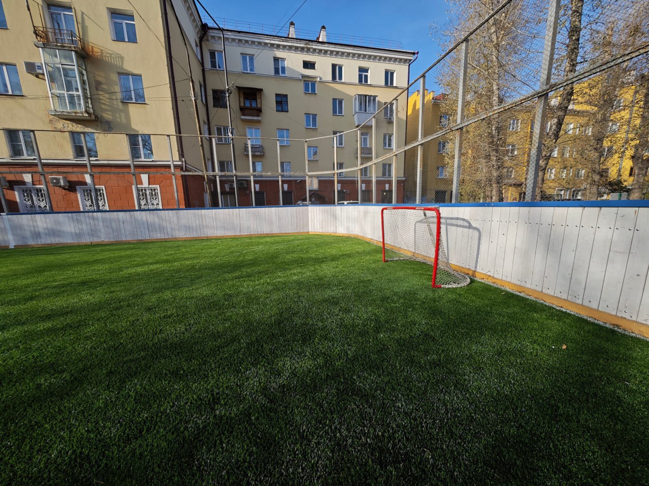Особенностью такого покрытия является его универсальность: искусственная трава сохраняет свойства под ледовым покровом. В 2026 году планируется провести покраску конструкций и подключить освещение.