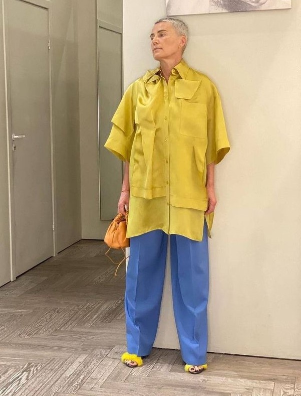 - Эпатажные сочетания: Для смелых модниц стоит попробовать неожиданные комбинации, например, сочетание желтых брюк с темным платьем. Отлично подойдут светло-зеленые остроносые туфли, а оригинальный картонный пакет послужит стильным аксессуаром.
