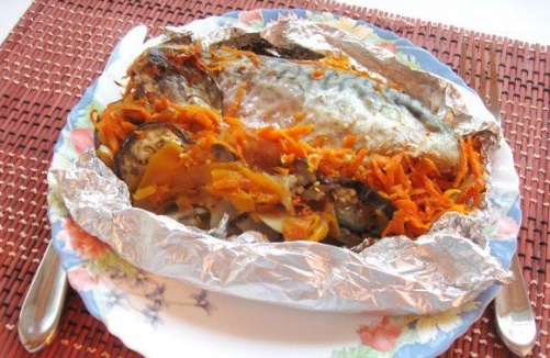 На финале выкладывается подготовленная скумбрия, и сверху её посыпают натертой морковью. Затем весь противень заворачивается в фольгу и отправляется в разогретую до 180 градусов духовку на 35-40 минут. За 10 минут до завершения запекания фольгу раскрывают, позволяя рыбе слегка подрумяниться.