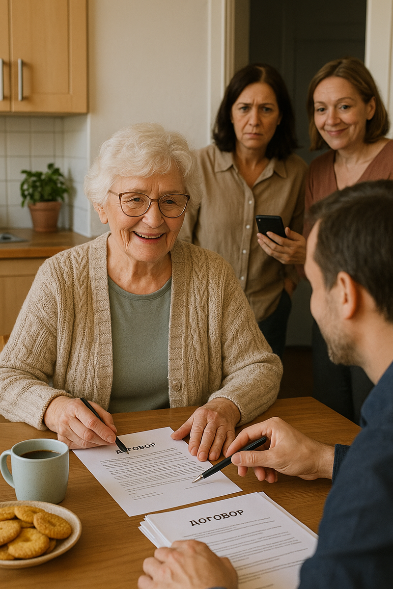 1. **Образ «доброй бабушки».** Опытные аферисты используют образ внушающей доверие пожилой женщины, способной предложить чашку чая и поделиться историями о жизни. За ее спиной действуют мошенники — так называемые «родственники» или «соседки», иногда даже подделанные юристы. Эта группа может получить справку о «сниженной дееспособности» жертвы.