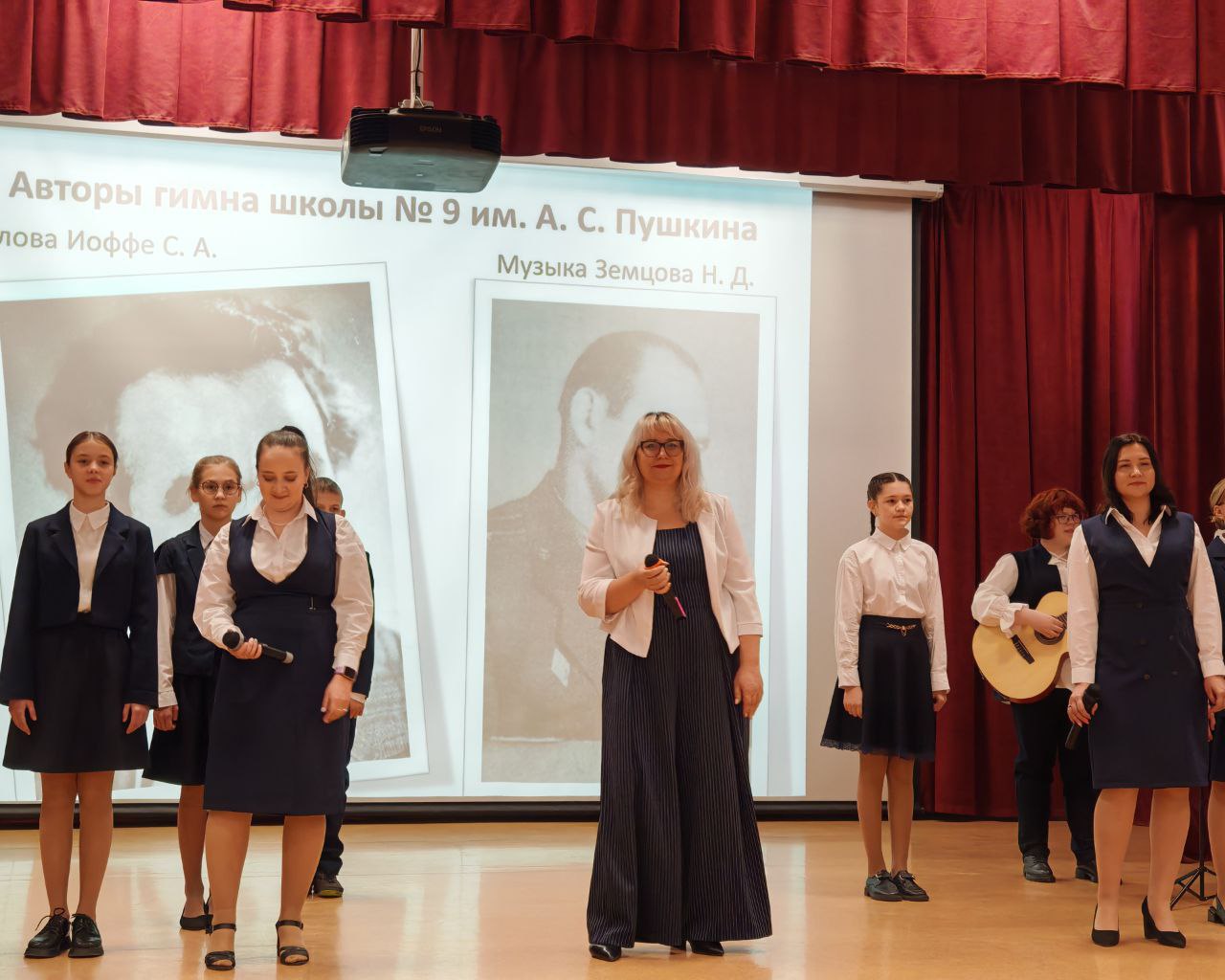 Торжественное мероприятие завершили исполнением гимна школы «Девятая имени Пушкина», автором которого является выпускник этого образовательного учреждения Сергей Иоффе, музыку сочинил иркутский композитор Николай Земцов.