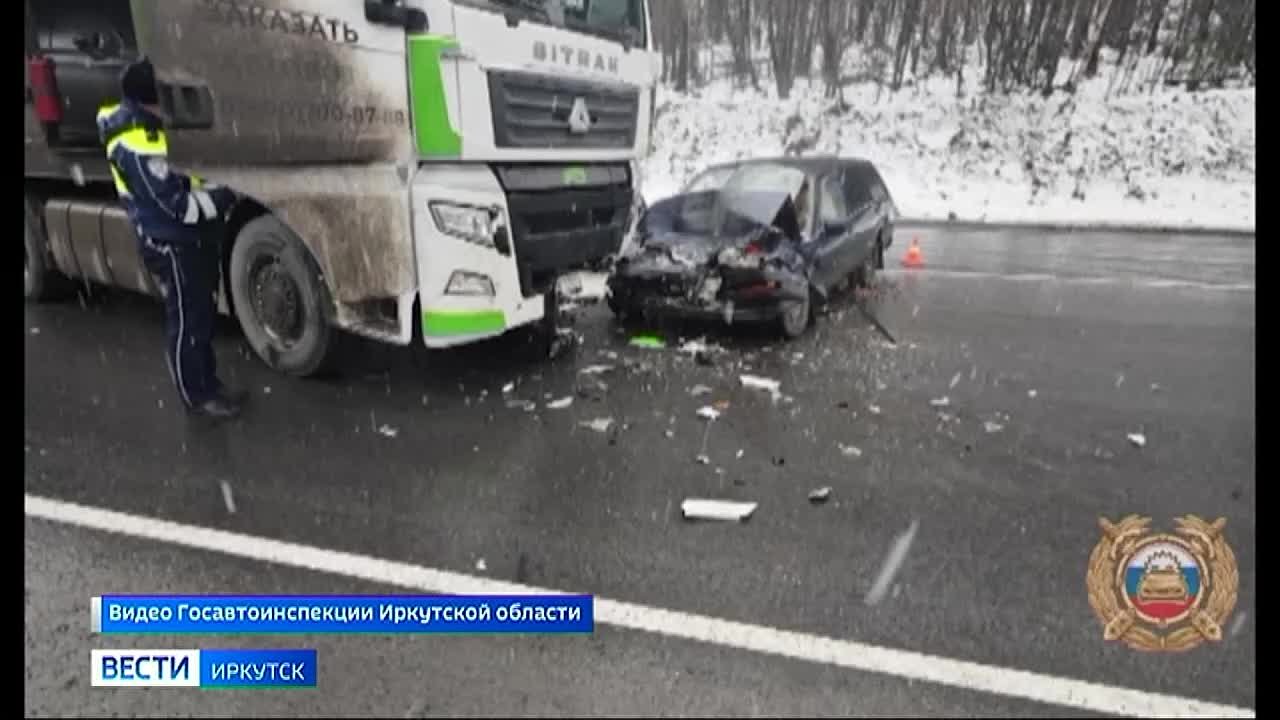 Момент ДТП попал на камеру видеорегистратора. По предварительной информации региональной Госавтоинспекции, «Тойота Камри» на 126-м километре федеральной дороги Р-258 «Байкал» врезалась в большегруз, который двигался во встречном направлении.