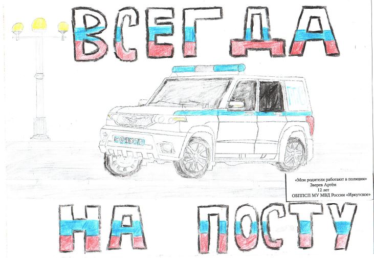 Считанные дни остались до окончания онлайн-голосования конкурса детских рисунков «Мои родители работают в полиции Иркутской области - 2025»! Взгляните, что нарисовал Артем Зверев из Иркутска, 12 лет.
