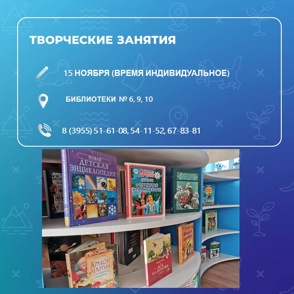 В субботу, 15 ноября, мастер-классы пройдут в библиотеках Ангарска. В библиотеке № 6 (8 микрорайон, дом 8) занятия, посвященные Новому году, проведут в 11.00 и в 15.00. В библиотеке № 9 (178 квартал, дом 2) мастер-класс по изготовлению кормушки начнется в 14.00. Пофантазировать на тему осени можно в библиотеке № 10 (95 квартал, дом 12). Начало в 15.00.