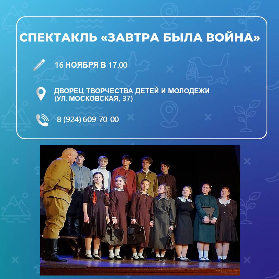 Образцовый театр-студия «Родничок» приглашает на спектакль по повести Бориса Васильева «Завтра была война». Постановку покажут 16 ноября в 17.00 во Дворце творчества детей и молодежи. Уточнить информацию можно по номеру 8(924)609-70-00.