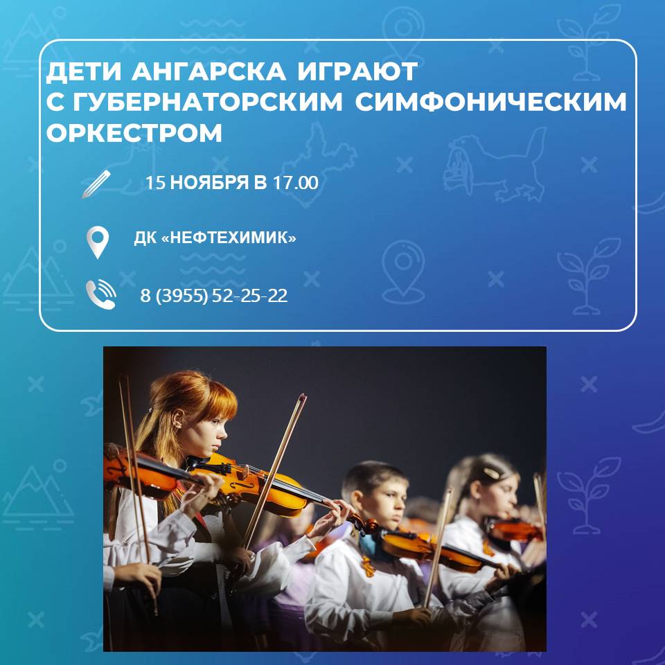 Учащиеся детских школ искусств Ангарска выступят в ДК «Нефтехимик» вместе с Губернаторским симфоническим оркестром 15 ноября . В программе – произведения Брамса, Хачатуряна, Вивальди. Начало в 17.00. Справки по телефону 8(3955)52-25-22.