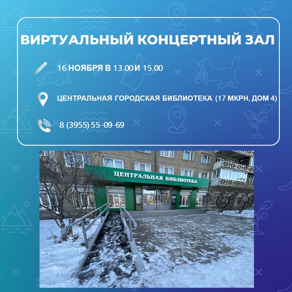 В читальном зале Центральной городской библиотеки (17 микрорайон, дом 4) 16 ноября в 13.00 покажут видеотрансляцию концерта «Сказки с оркестром. Оскар Уайльд – «Звездный мальчик». А в 15.00 можно послушать Государственный академический камерный оркестр России. Справки по телефону 8(3955)55-09-69.