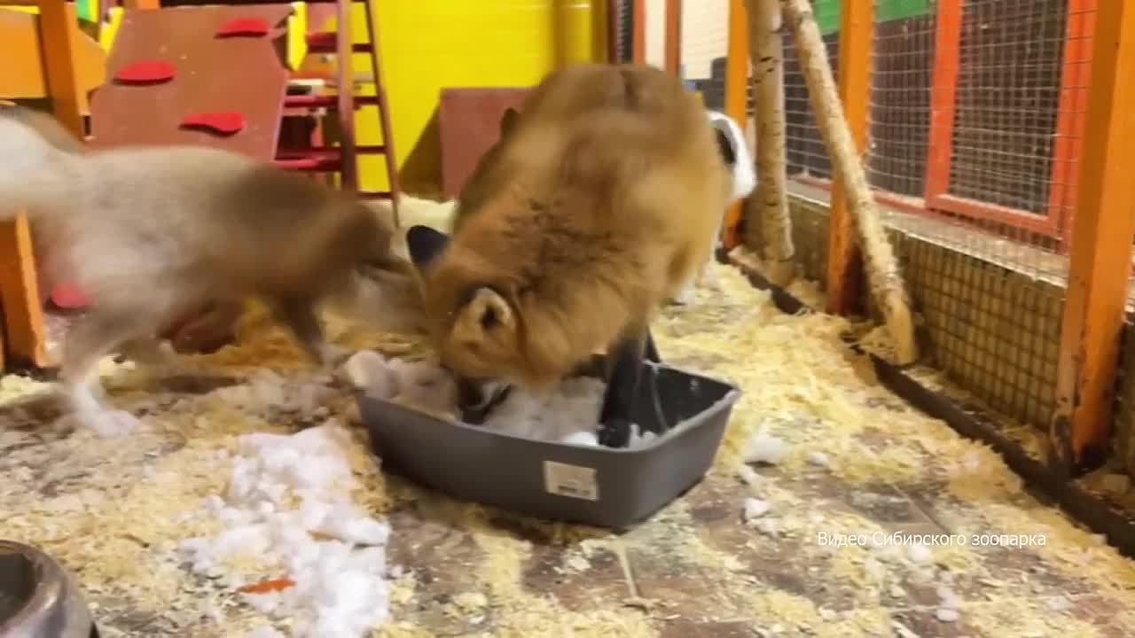 Только посмотрите, с каким восторгом и интересом лисы из Сибирского зоопарка плещутся в чашке со снегом.