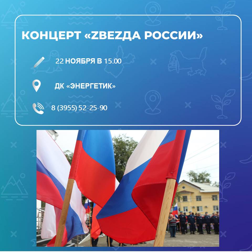 Творческие коллективы Дворца культуры «Энергетик» и детских школ искусств выступят на большом патриотическом концерте «Zвеzда России». Увидеть его можно 22 ноября в 15.00 в ДК «Энергетик». Справки по телефону 8(3955)52-25-90.