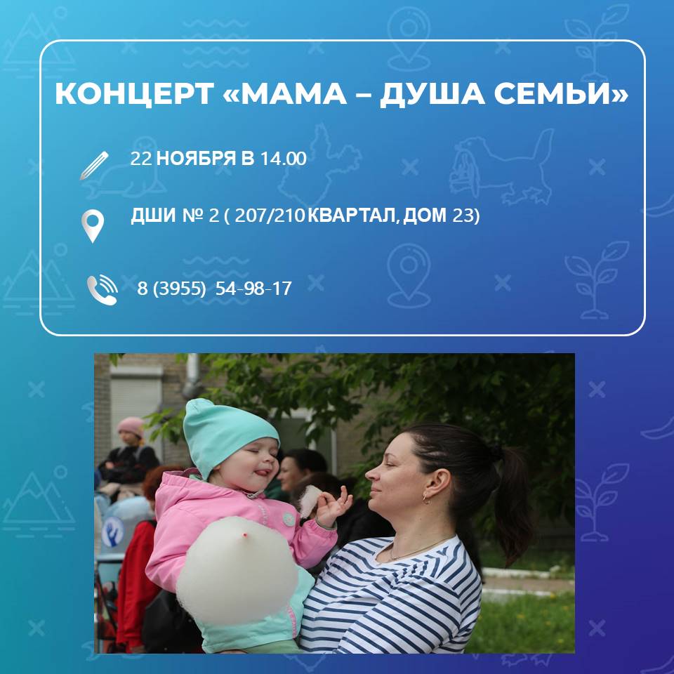 Праздничный концерт, посвященный Дню матери, проведут воспитанники детской школы искусств № 2 (207/210 квартал, дом 23). Концерт начнется 22 ноября в 14.00. Вход свободный.