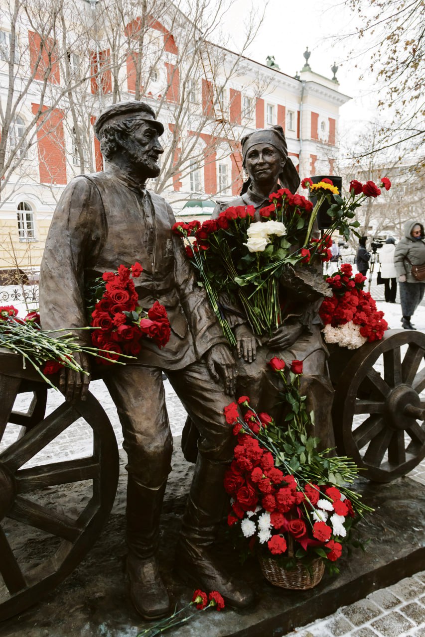 Еще раз покажем памятник народным артистам Виталию Венгеру и Наталии Королевой. Скульптурную композицию разместили вблизи Дома актера и камерной сцены Иркутского академического драматического театра имени Н. П. Охлопкова. Она представляет собой фигуры актеров в образах героев спектакля «Поминальная молитва» — молочника Тевье и его жены Голды. Знаменитую пьесу Григория Горина иркутский зритель впервые увидел 27 лет назад — в июне 1998 года.