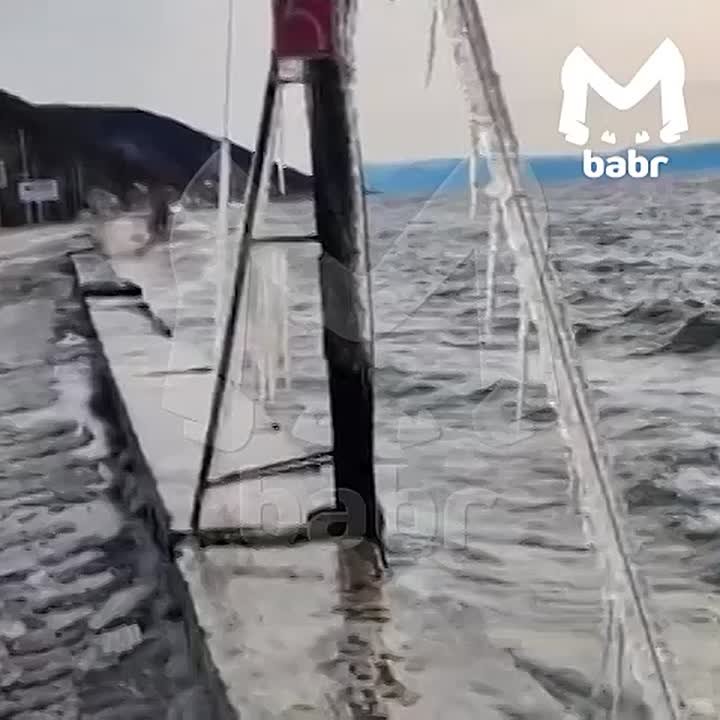Волны хлещут через ограждения, вода тут же превращает проезжую часть в каток. Дорожники всё чистят и посыпают, но предупреждают: ездить там нужно очень осторожно.