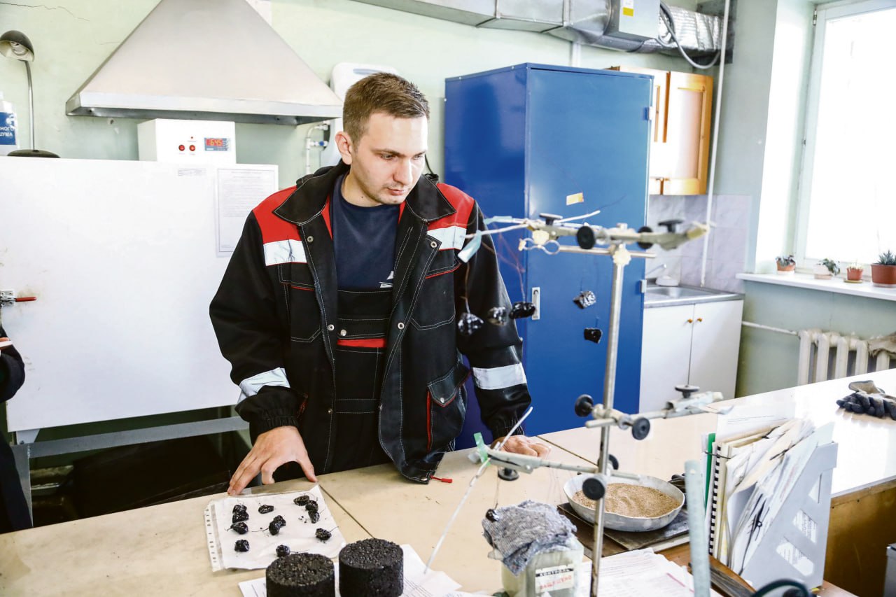 Интересный момент: прежде чем сотрудники завода начнут замешивать многотонную партию асфальтобетона, в начале строительного сезона в лаборатории подбирают оптимальный состав асфальтобетонной смеси — создают небольшую пробную порцию в 40–50 кг. Берут именно тот щебень и тот песок, которые производят собственными силами на дробильно-сортировочном комплексе, добавляют все необходимые составляющие и замешивают. Готовую смесь тут же исследуют на качество и отдают рецепт на производство.