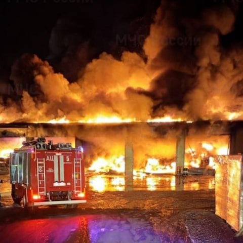 Большой пожар в Жилкино. Предварительно, горят гаражи и цех по производству стеновых панелей. Огонь охватил 1000 квадратных метров.