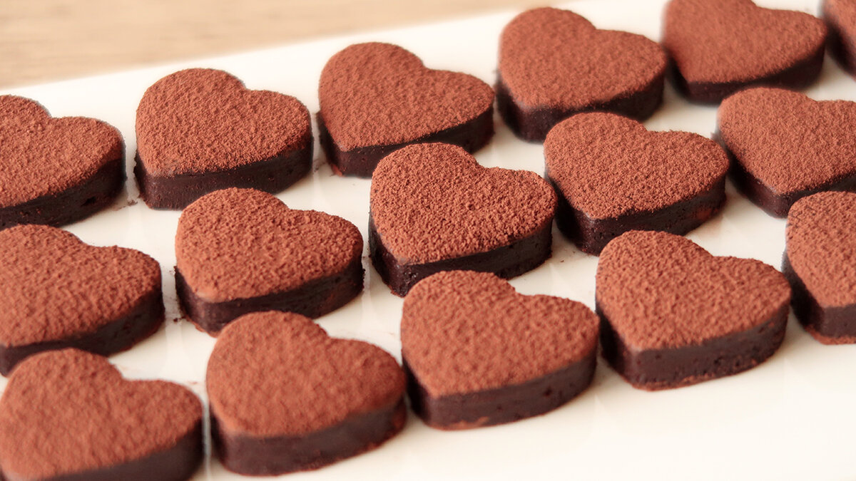 После охлаждения десерт превращается в пластину, из которой можно вырезать сердечки или прямоугольники. Обрезки не стоит выбрасывать – их можно снова скатать и переработать. Готовые фигурки обсыпают какао, что придает им завершённый вид и делает более аппетитными.