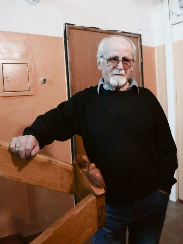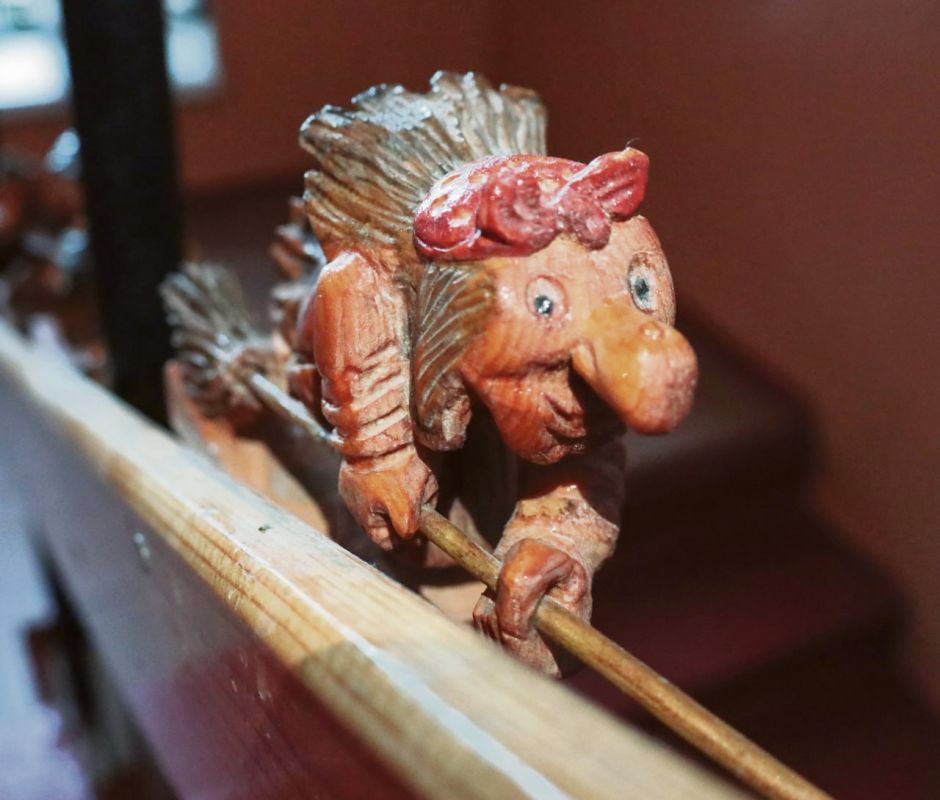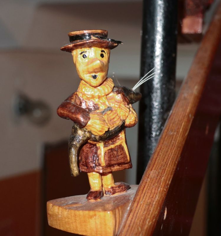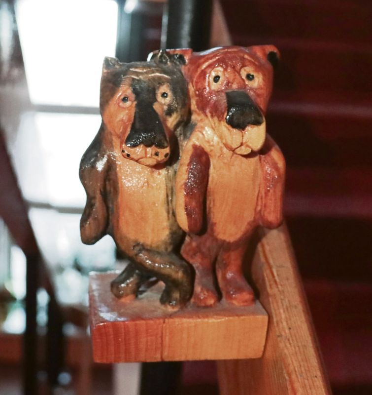 А на перилах поселились небольшие деревянные фигурки. Встречает жителей и гостей волк в желтых клетчатых штанах на одной лямке через плечо и с красной пуговицей на пузе: «Зашел — улыбнись!» За ним — соболь, свернувшаяся калачиком кошка и кот с хвостом трубой, птички, медведи, зубастый крокодил Гена с Чебурашкой, разные Микки-Маусы, дед Мазай в лодке с зайцами. Всю эту красоту своими руками сделал житель этого подъезда Геннадий Демидов. Резьбой по дереву он занялся после выхода на пенсию.