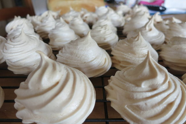 Разогреть духовку до 90-100 °C и подготовить противень с пергаментом. Массу безе можно выкладывать с помощью кондитерского мешка или ложки. Время высушивания в духовке составляет около 1,5-2 часов; дверцу лучше оставлять приоткрытой. Как только меренги подсохнут и легко отделятся от бумаги, можно считать их готовыми.