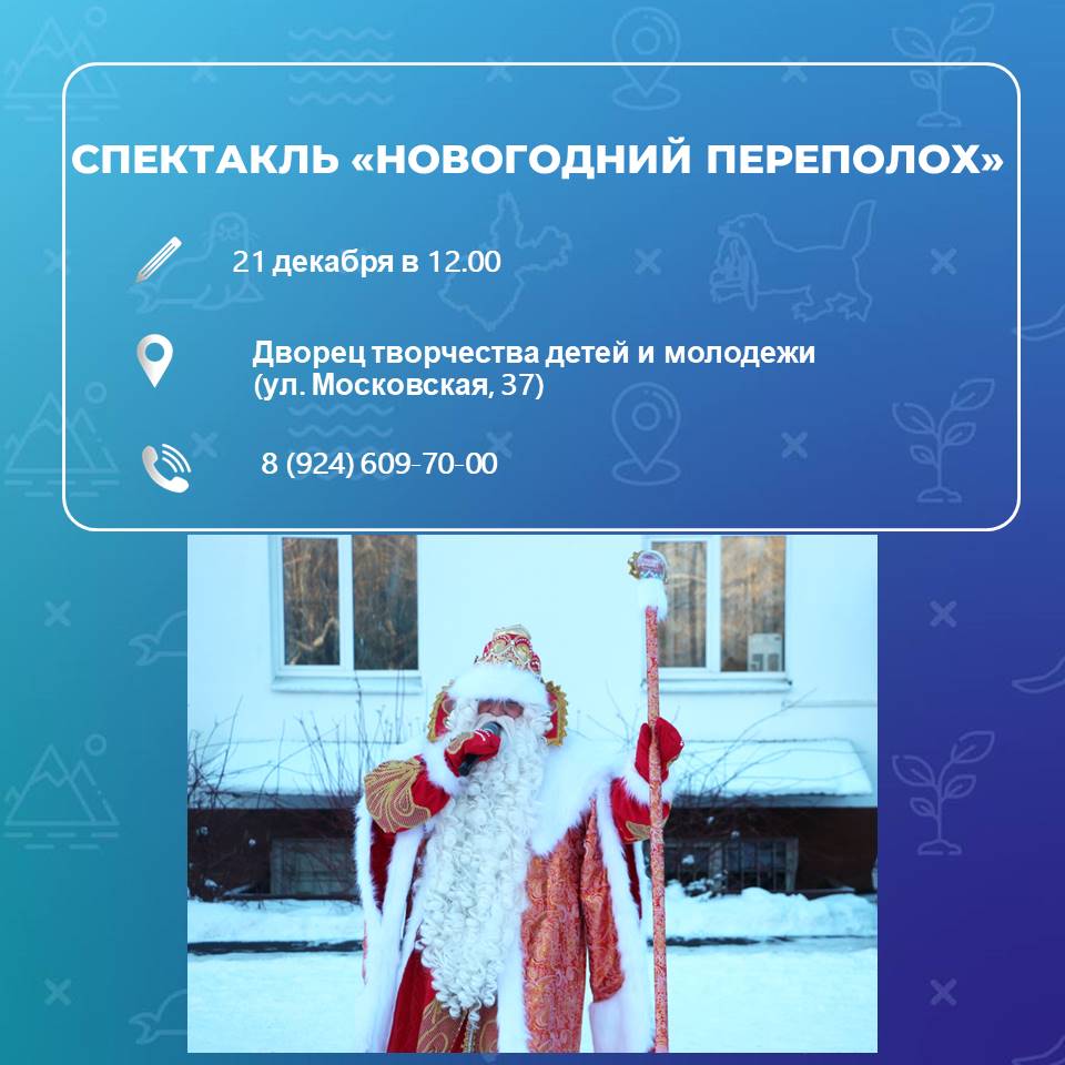 Дворец творчества детей и молодежи (ул. Московская, 37) и образцовый театр-студия «Родничок» приглашает жителей и гостей города в воскресенье, 21 декабря, в 12:00 на спектакль «Новогодний переполох», а так же на встречу с Дедом Морозом у празднично ёлки. Справки по телефону 8(924)609-70-00.