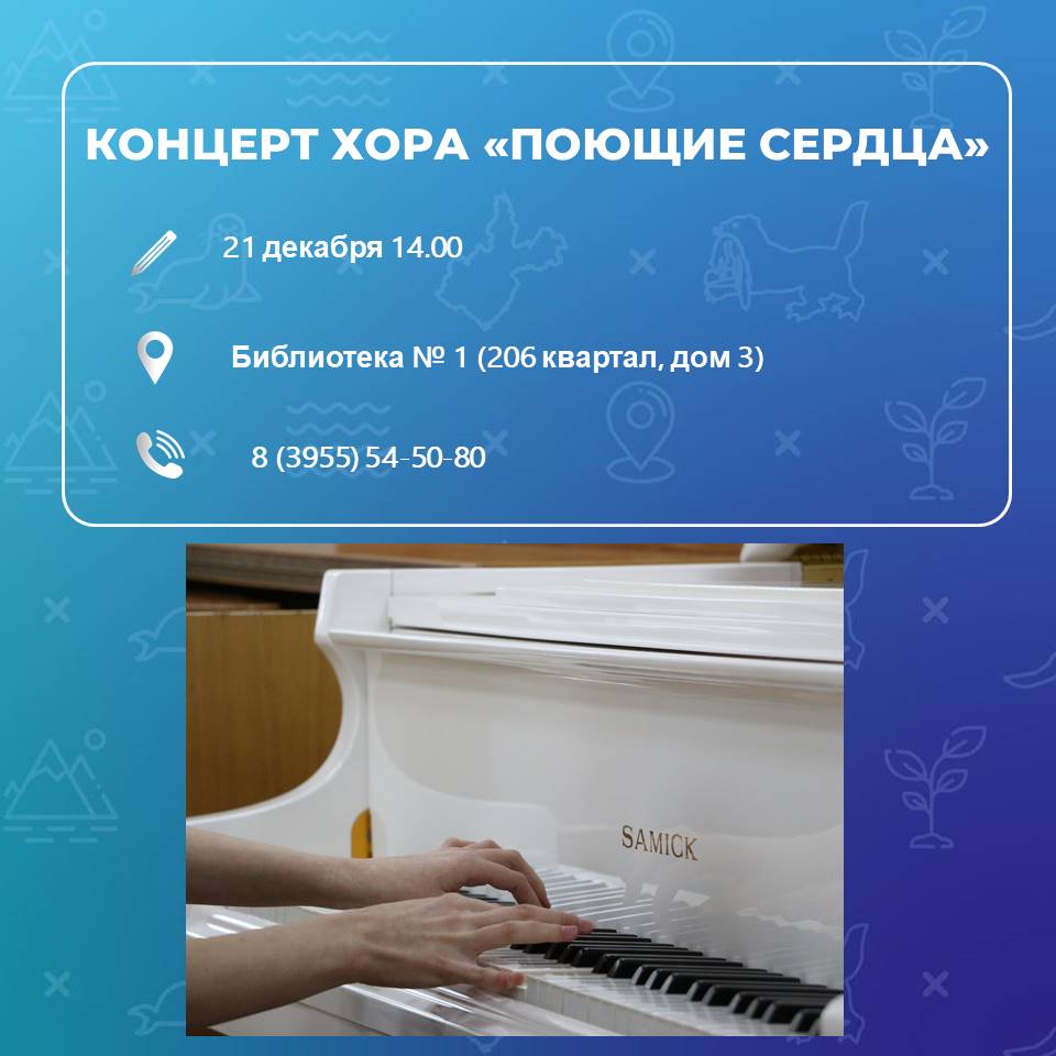 В библиотеку № 1 им. В. Алексеева (206 квартал, дом 3) приглашают 21 декабря на концертную программу хора «Поющие сердца». Начало в 14.00. Справки по телефону 8(3955)54-50-80.