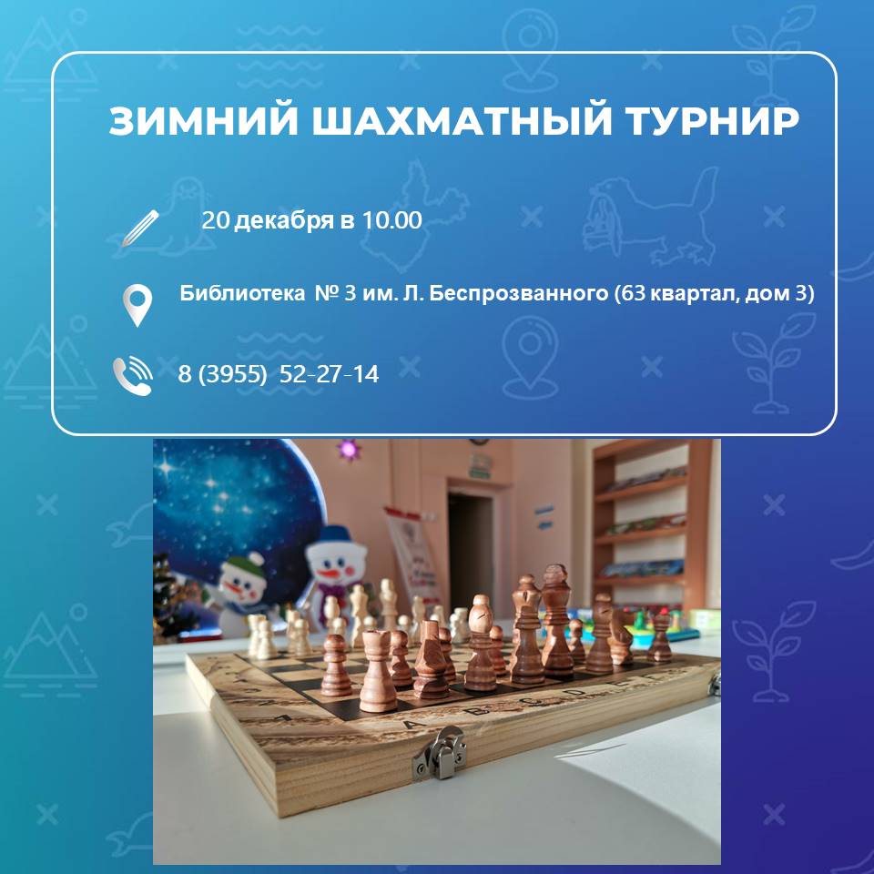 Утром субботы, 20 декабря, истинных фанатов игры королей приглашают на шахматный турнир в библиотеку № 3 им. Л. Беспрозванного. Комплект шахмат – с собой. Начало в 10.00. Справки по телефону 8(3955)52-27-14.
