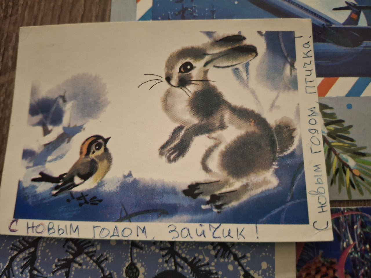 А серые зайчики у ёлки? Самые тёплые открытки отправляли самым близким. Зайчик- словно намёк: «Ты для меня - самый родной, береги себя».
