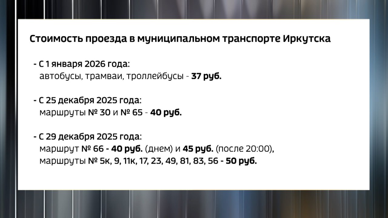 Также с 25 декабря в Иркутске до 40 рублей вырастет стоимость проезда на маршрутах № 30 и 65. А с 29 декабря до 40 рублей днем и 45 — после 20:00 подорожает проезд на автобусе № 66. По 50 рублей за поездку придется платить в автобусах № 5к, 9, 11к, 17, 23, 49, 81, 83, а также № 56.