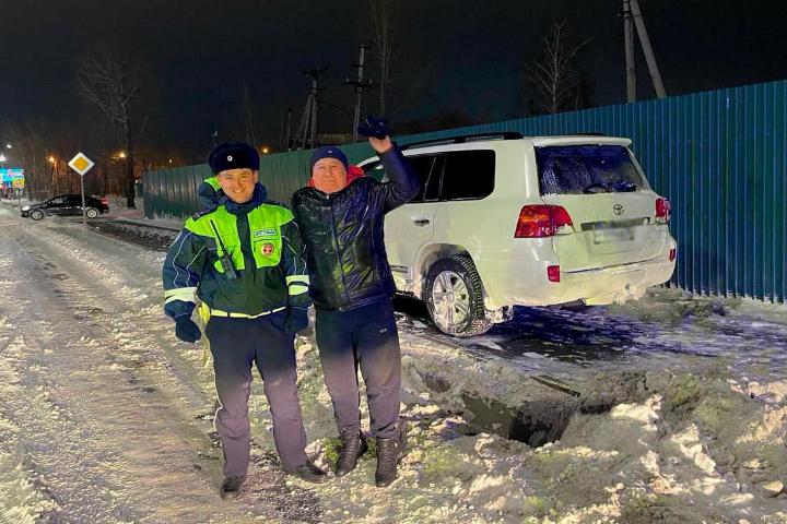 В Иркутске владелец «Toyota Land Cruiser» случайно заехал в скрытую под снегом водоотводную канаву. Самостоятельные попытки выбраться ни к чему не привели, а водитель эвакуатора лишь развел руками: спецтехника могла серьезно повредить автомобиль при попытке вытянуть его тросом. На помощь пришел патрульный экипаж ДПС.