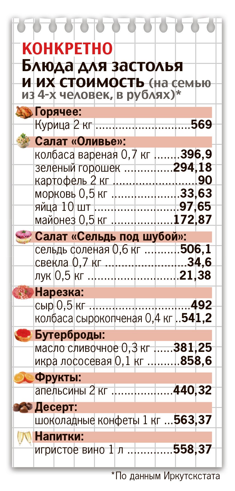 До Нового года остались считанные дни! Если вы еще не начали запасаться продуктами, то самое время подумать, чем будете угощать близких. Кстати, сейчас праздничный стол для жителей Иркутска обойдется в среднем в 6051,42 рубль. Такие подсчеты сделала КП-Иркутск на основе данных специалистов Иркутскстата. За основу корреспондент взял самые распространенные блюда с расчетом на четыре персоны: одно горячее, два салата, нарезка сырно-колбасная, бутерброды с икрой, апельсины, конфеты и алкоголь.