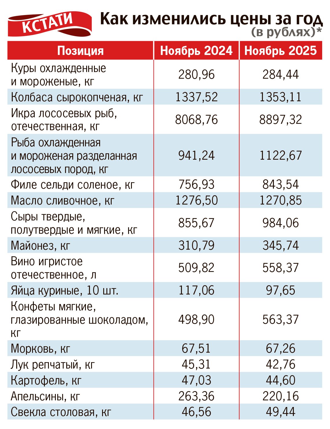 К слову, в прошлом году исследование проводили в ИТ-компании «Эвотор». Так, в конце в 2024 года застолье обошлось бы семье из Приангарья в среднем в 5943 рубля. Однако меню было обширнее. В список продуктов организации также вошли: крабовые палочки, два вида хлеба, свиные ножки, шпроты, маринованные огурцы, газировка, торт, мандарины, бананы и яблоки.
