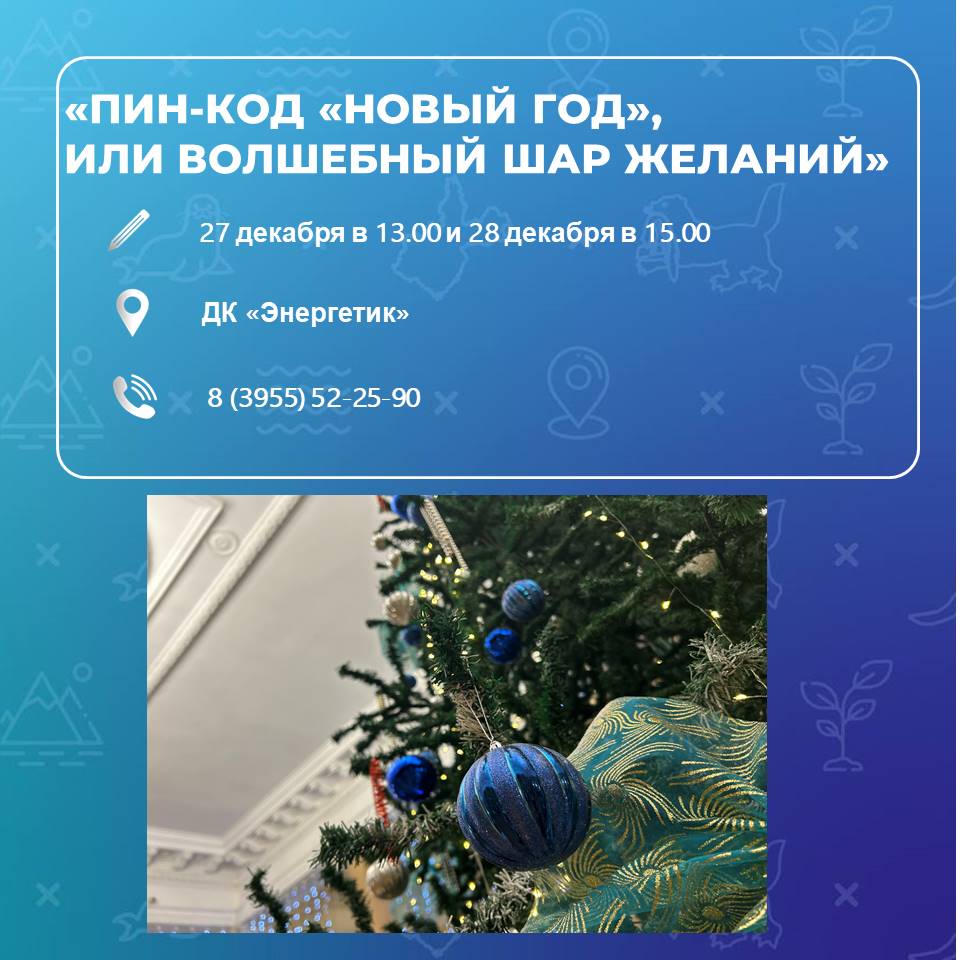 Дворец культуры «Энергетик» в эти выходные порадует семейной постановкой «Пин-код «Новый год», или Волшебный шар желаний». Сказку для всей семьи, которая вернет веру в чудеса, можно увидеть 27 декабря в 13.00 и 28 декабря в 15.00. Справки по телефону 8(3955)52-25-90.