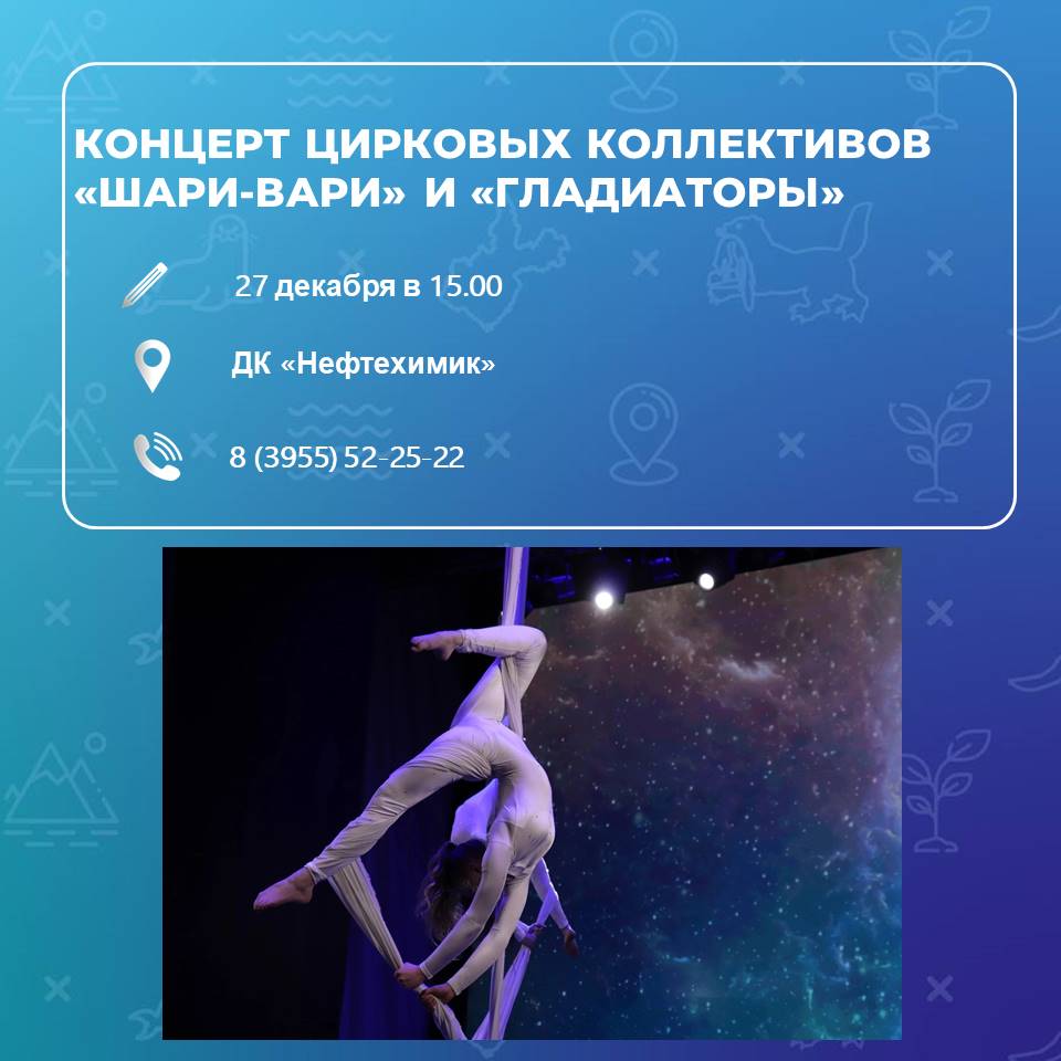 Цирковые коллективы «Шари-Вари» и «Гладиаторы» 27 декабря выступят с концертом «Три богатыря и приключения под Новый год» в ДК «Нефтехимик». Начало в 15.00. Справки по телефону 8(3955)52-25-22.