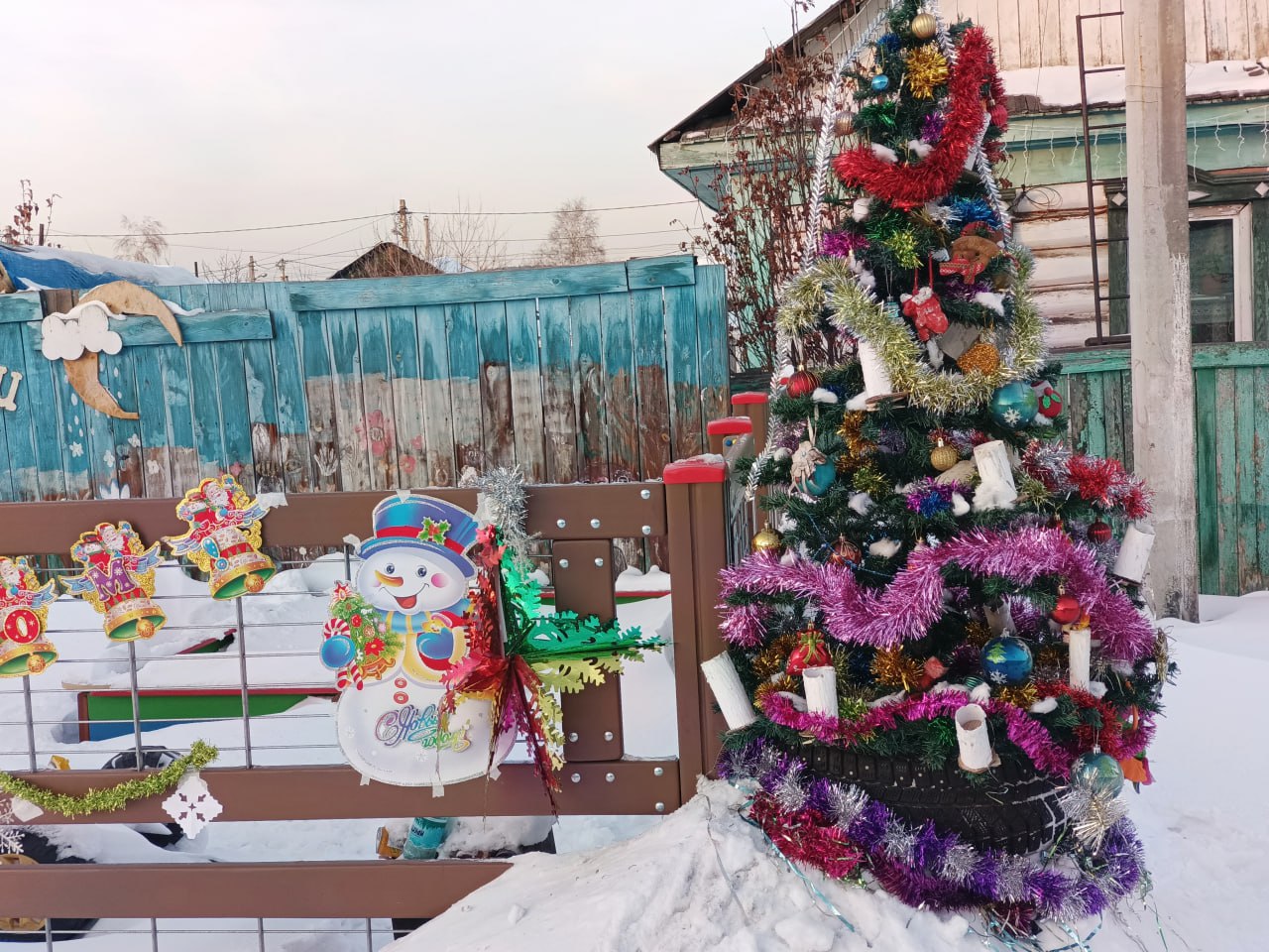 Жители ТОС «Лесной» украсили детскую площадку на улице Добрая. Иркутяне вышли семьями, убрали снег, поставили елку, а новогодние игрушки жители микрорайона изготовили своими руками.