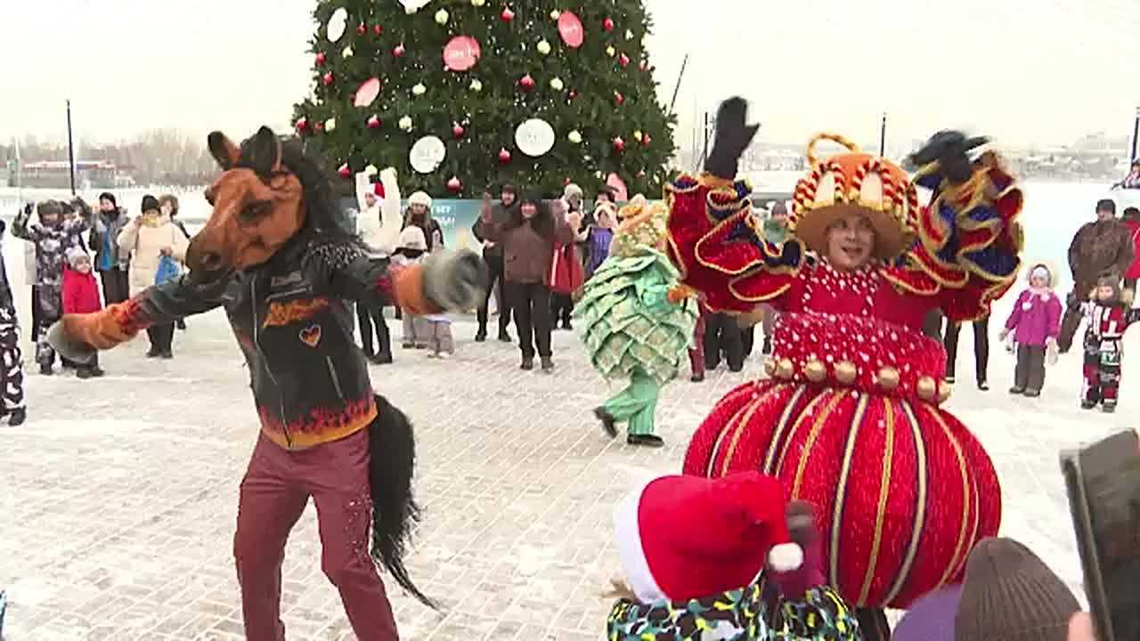 Новогоднюю елку с фотозоной и ледовыми скульптурами открыли на площади у памятника Александру III в Иркутске