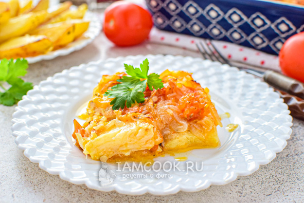 После того как рыба замариновалась, необходимо подготовить форму для запекания, смазав её растительным маслом. Выложив филе в один слой, сверху равномерно распределяются тушёные овощи. Это придаст оттенок нового аромата и сделает блюдо более гармоничным.