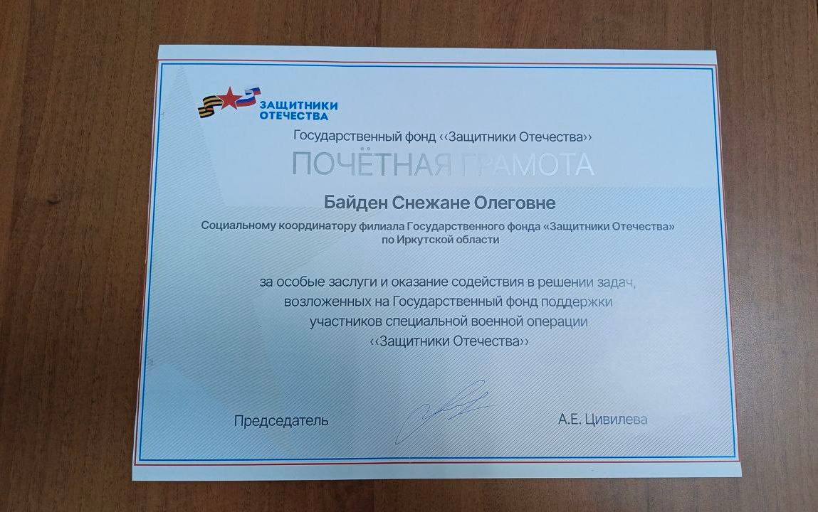Награду Снежане Байден вручил губернатор Иркутской области. Кроме того, она получила почётную грамоту от заместителя министра обороны России Анны Цивилёвой — за вклад в работу государственного фонда «Защитники Отечества».