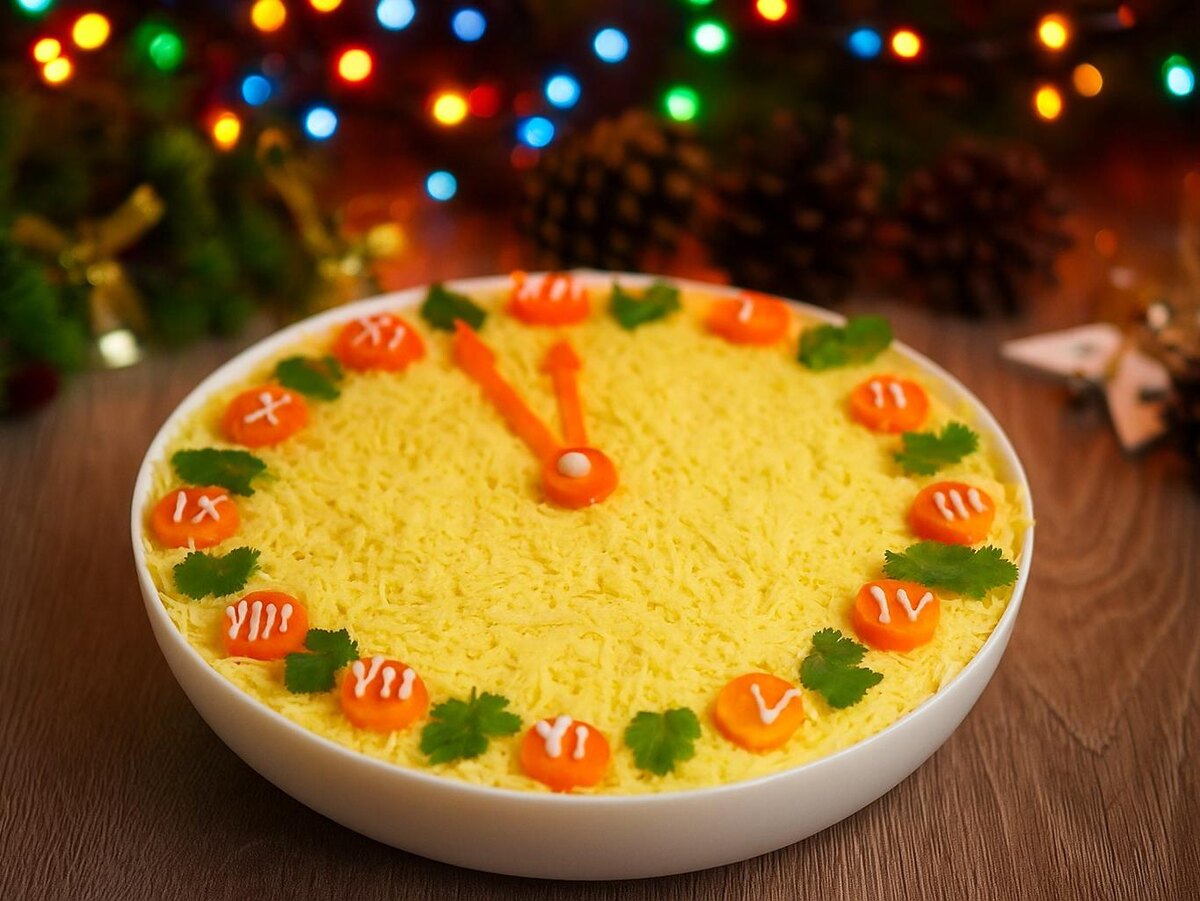 Салат «Часы» – это не просто блюдо, а настоящая кулинарная находка для новогоднего стола. Его восхитительный вкус и впечатляющее оформление моментально становятся центром внимания.