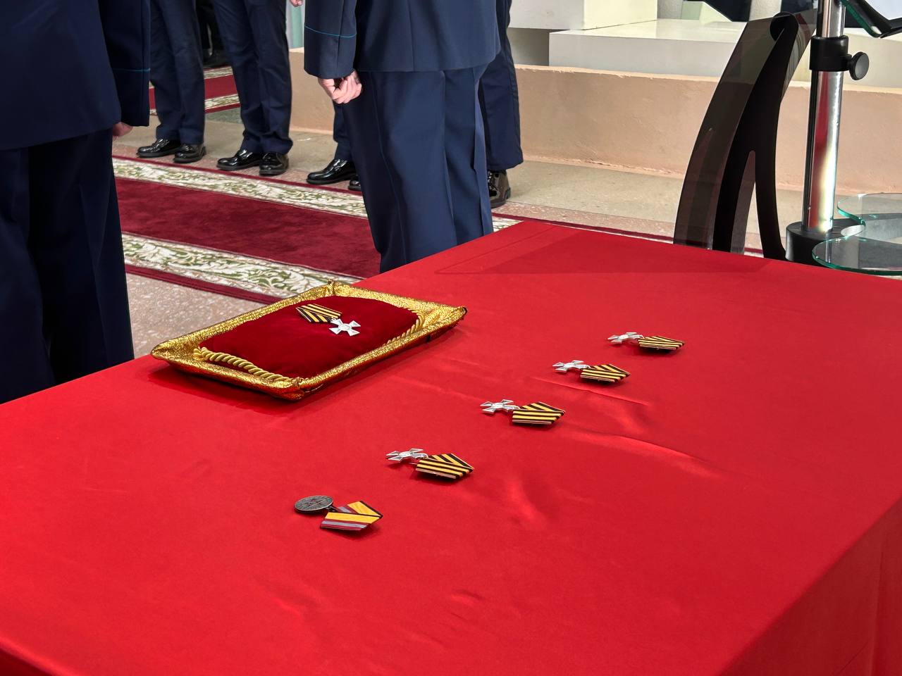 Командир войсковой части Константин Владимирович Петрунин передал медаль «Участнику специальной военной операции» и пять орденов Святого Георгия, Георгиевские кресты IV степени.