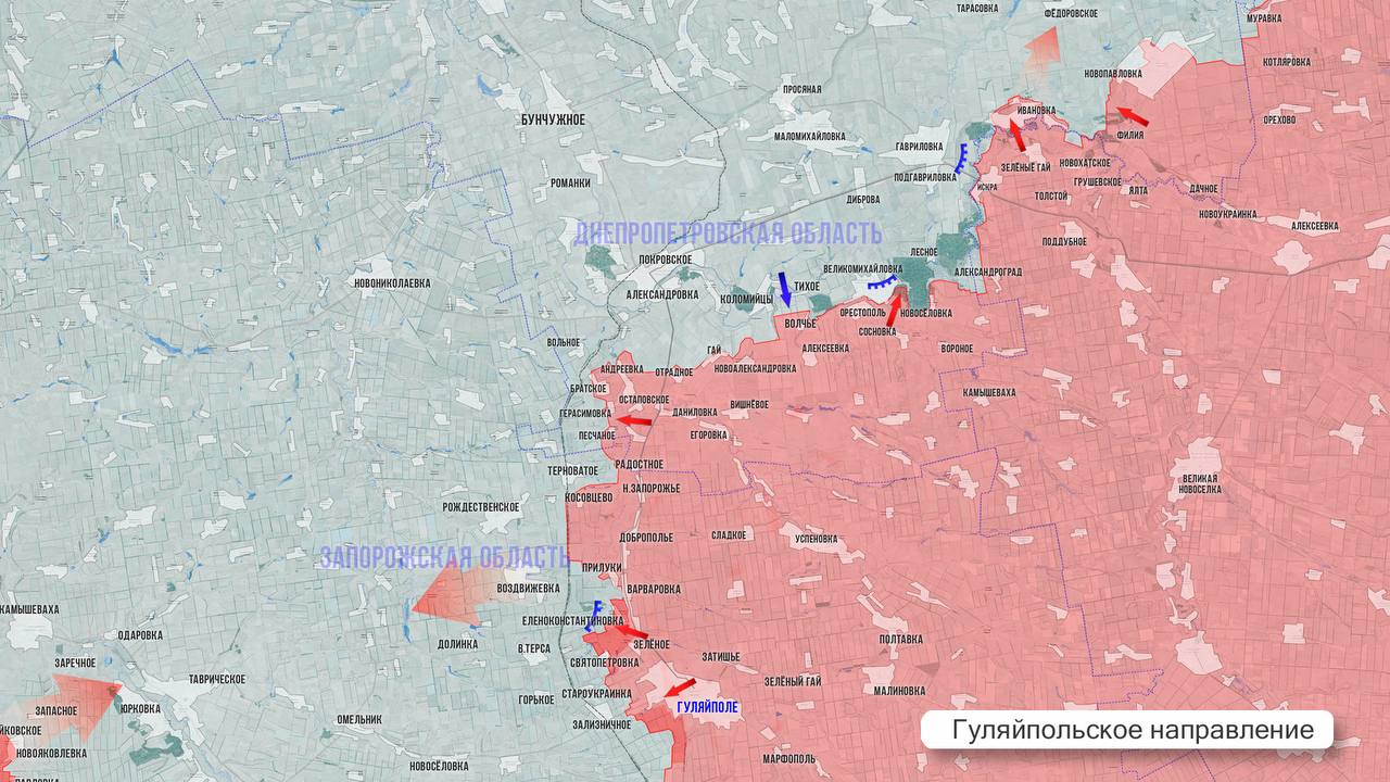 На Гуляйпольском участке армия России, прорвав первую линию обороны ВСУ по р. Гайчур, создала непрерывную зону контроля от южных окраин Терноватого до Гуляйполя. Этот плацдарм позволяет российской группировке приступить ко взлому второй линии обороны противника Верхняя Терса-Воздвиженка-Рождественское. Выше по фронту расширена зона контроля в районе Братского, а также северо-восточнее Ивановки.