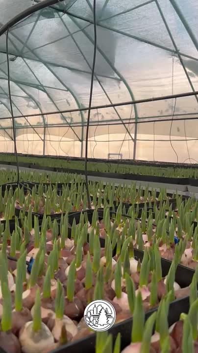 Еще с декабря луковицы цветов насадили на штырьки в лотках для выгонки, установили полив водой с подкормкой и постепенно повышают температуру в теплицах.