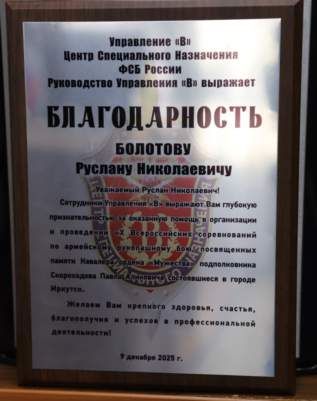 Михаил Мелкоступов вручил Руслану Болотову благодарственное письмо от офицеров ЦСН ФСБ России «Вымпел» за помощь в организации и достойное проведение с 2015 года Всероссийского турнира по армейскому рукопашному бою, посвященного памяти кавалера ордена Мужества, сотрудника ЦСН ФСБ России Павла Скороходова.