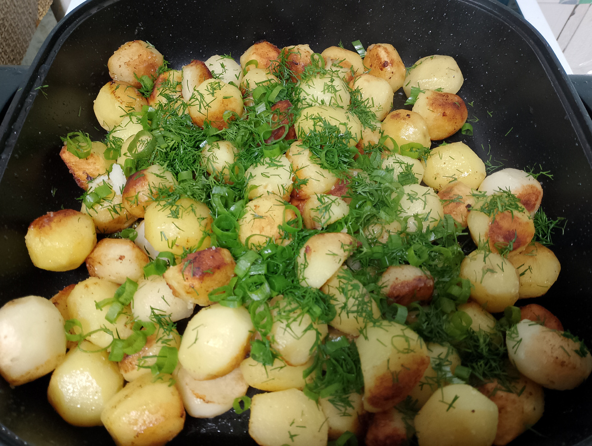 Золотистые клубни, обжаренные до хрустящей корочки, создают потрясающий контраст с мягкой серединкой. Их аромат наполняет кухню, вызвав аппетит и желание немедленно попробовать. Чтобы добавить яркости и свежести, щедро посыпьте картофель свежей зеленью — укропом и зеленым луком. Укроп будет радовать своим характерным вкусом, а зеленый лук добавит легкую остринку, создавая гармоничное сочетание оттенков и ароматов.