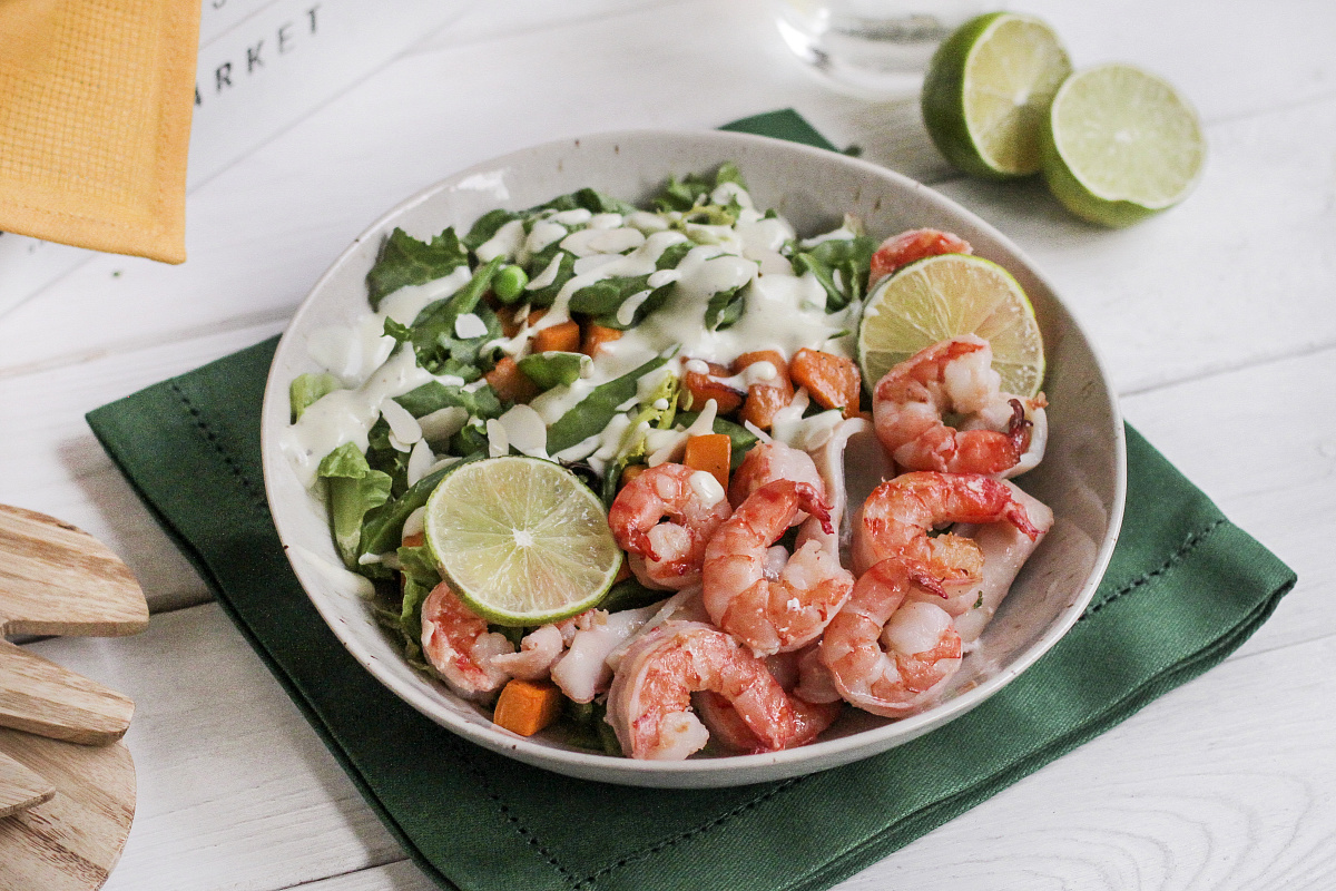 Шаг 4: На тарелке выложите микс салата, запеченный батат, обжаренные морепродукты и стручковый горошек. Полейте соусом и аккуратно перемешайте. Перед подачей посыпьте миндальными лепестками.