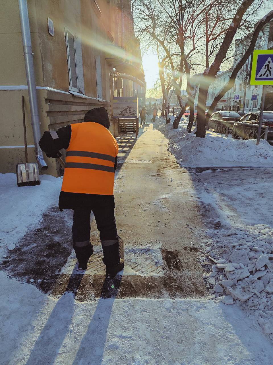 Вручную продолжают очистку пешеходных зон на Шевцова, Рабочего Штаба, Радищева, Софьи Перовской, Октябрьской Революции, Фридриха Энгельса, Братской, Свердлова, Литвинова, Халтурина, Горького, Мира, Багратиона, Аносова, Вампилова, Маяковского, Маршала Конева и на бульваре Рябикова.
