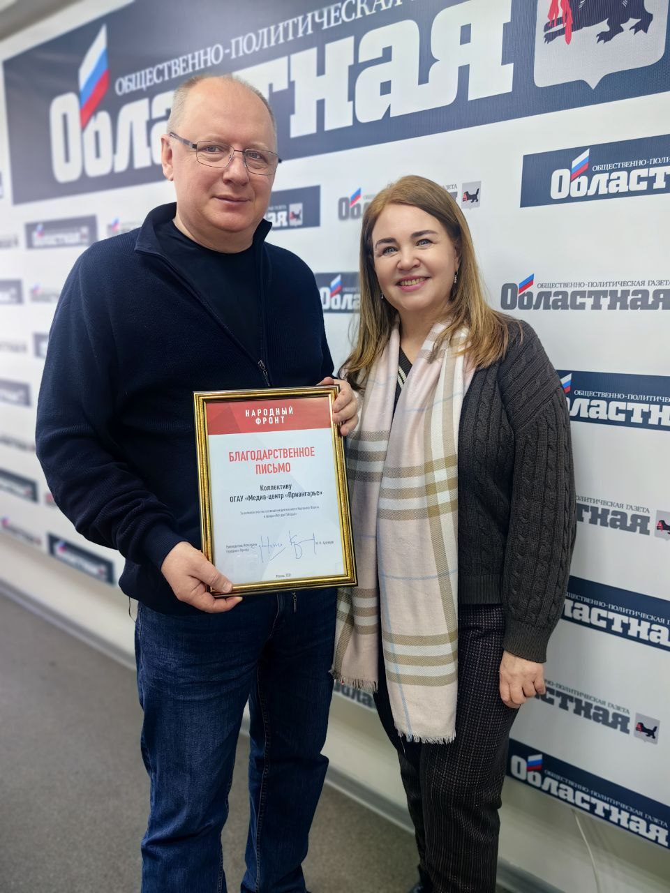 За активное участие в освящении деятельности Народного фронта и фонда «Все для Победы!» руководитель регионального исполкома Елена Зубун вручила коллективу ОГАУ «Медиа-центр «Приангарье» благодарственное письмо руководителя исполкома «Народного фронта» Михаила Кузнецова.