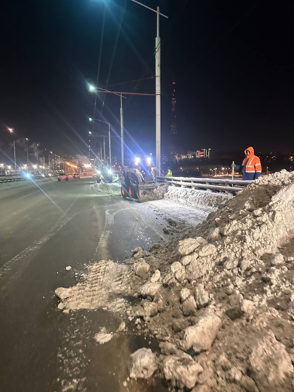 Сотрудники МУП «Служба эксплуатации мостов» выполняют работы по уборке лотков, тротуаров, лестничных сходов и ограждений на мостовых сооружениях. Ночью вывозили снег с Академического моста, путепроводов на улице Лермонтова и станции Батарейная.