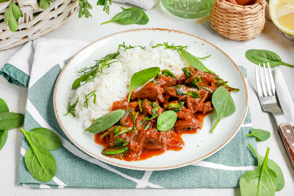 Уютный аромат, лениво распадающийся на кухне, напоминает о простом счастье вечернего ужина. В основе — немного говядины, свежий шпинат и белый рис, которые вместе рождают знакомый и понятный вкус. Нежные кусочки мяса сочетаются с лёгким пряным каркасом, а шпинат вносит зелёную свежесть, превращая обед в маленький семейный ритуал.