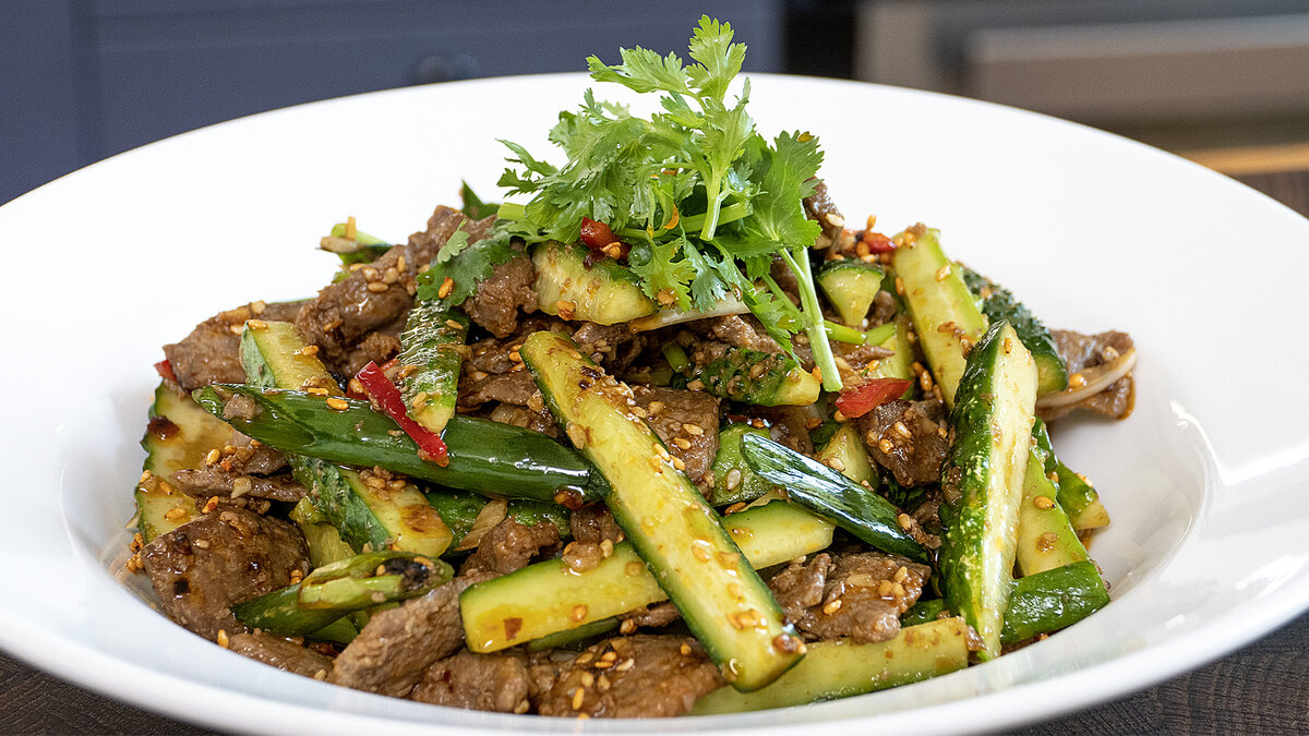 Пока говядина жарится, стоит заняться огурцами. Их необходимо нарезать вдоль на шесть частей, добавить острый перец и мелко порезанную кинзу. Всё это смешивается вместе с солью, приправой Lao Gan Ma и крупно нарезанным зеленым луком.
