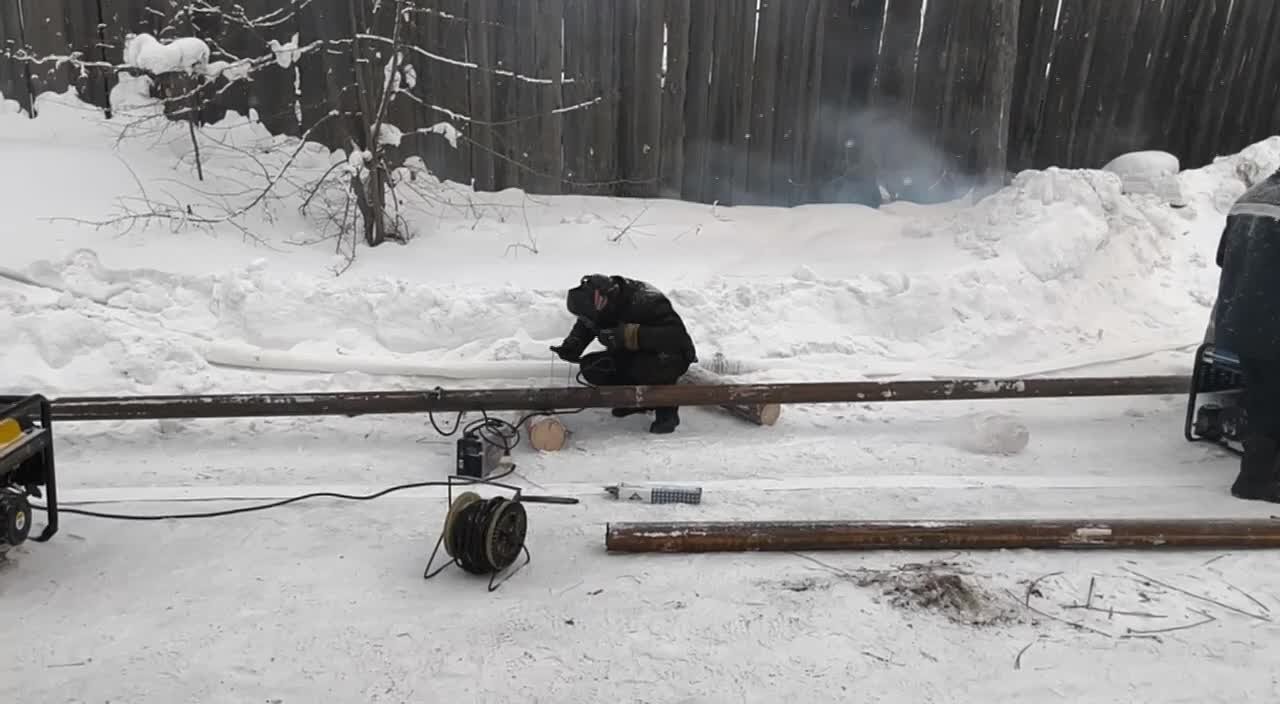 На месте перемерзания продолжается монтаж резервного металлического водопровода длиной 750 метров. Прокладывают сварный металлический водовод.