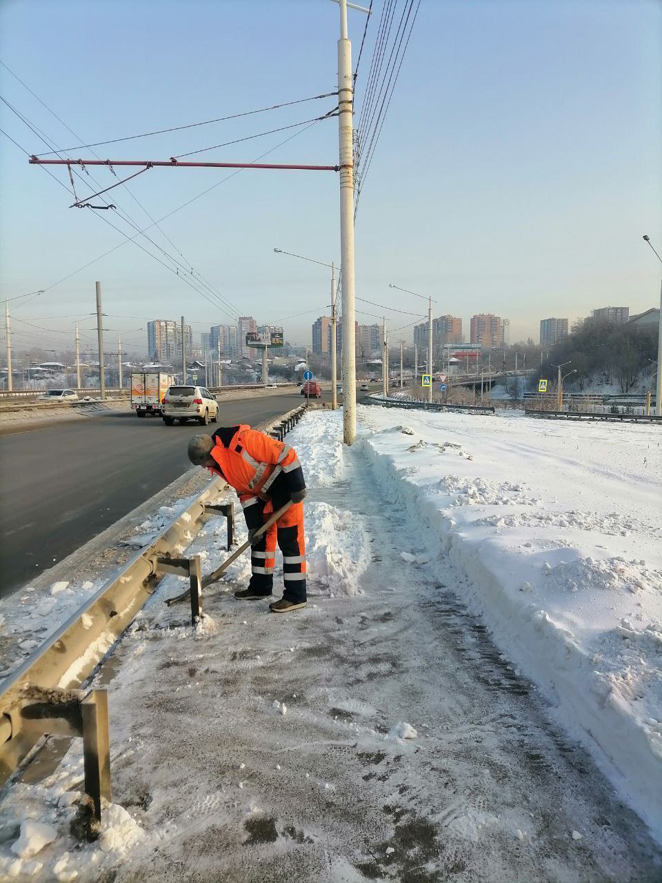 На мостах и путепроводах тоже продолжается вывоз снега. Преимущественно такие работы выполняют вечером и в ночное время. Днем на объектах чистят тротуары и лестницы.